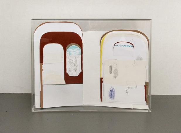 drawing, collage, plexiglass box